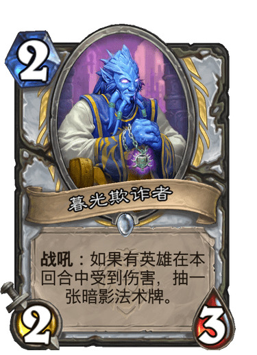 (开始吐槽这次的新卡)感觉这次给的暗牧的卡还是太保守了,如果设计师你想推一共新体系,那你就强推。以这张暮光欺诈者举例子,这张223明显就不厉害,一个新体系没有超模牌谁会拿,我觉得应该改成如果你的牌库里都是暗影法术牌就抽一张暗影法术牌,不应该设计这么多条条框框。