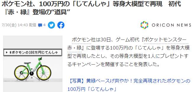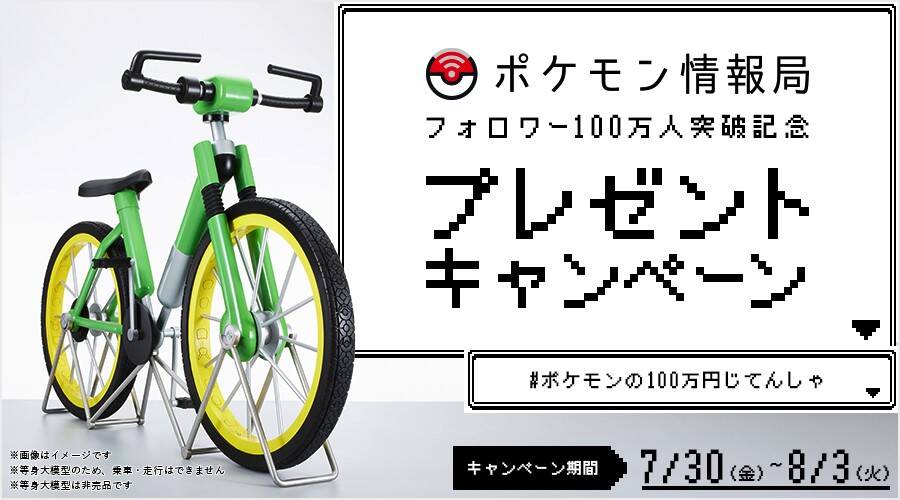 ·不过如今宝可梦官方为了纪念官方推特关注突破100万,于7月30日~8月3日举行抽奖,大奖就是 一辆等大的百万自行车···模型,官方提醒,这只是辆模型不能实际骑行,而且真实价值并非100万日元,参与抽奖条件跟简单,关注宝可梦情报局并跟贴标签随便发表点内容就有机会,感兴趣的有条件的粉丝可以关注下了。