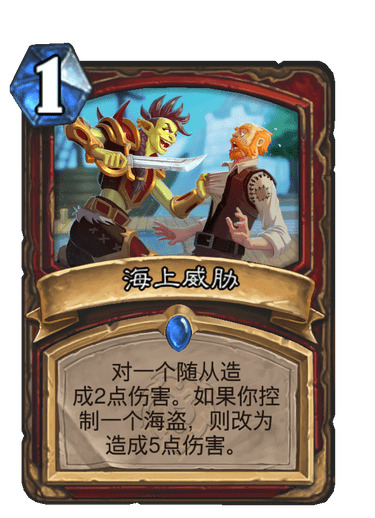 海上威胁算是一张盾猛的竞争卡了,虽然狗贼叔叔表示还是会带盾猛,不过如果你真的要构筑一套海盗防战,这张卡是绕不过去的,新的标准环境很大概率是快攻互锤,有这么一张卡对前期节奏算是不小的帮助,在任务完成的情况下这张卡就是一张固定的打五,但加入这张卡进构筑后的抽牌问题,就需要各位玩家自己考虑如何构筑了。