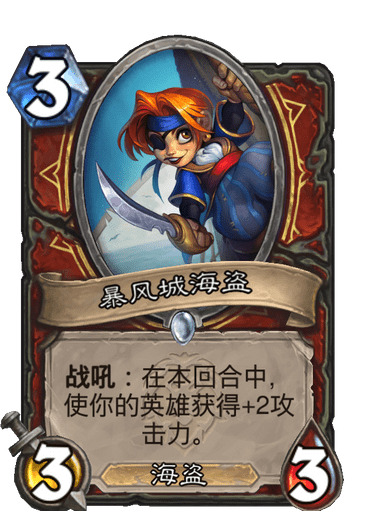 暴风城海盗也是张中规中矩的海盗,算是设计师希望战士在使用任务后补节奏的单卡,3费准时下可以补刀,后期下也可以打出斩杀效果或者配合前锋战斧来打出过牌效果。当然,目前一个比较大的弱点是被毁灭战舰召唤出来,那就比较亏了,不过这一般不在考虑范围内。