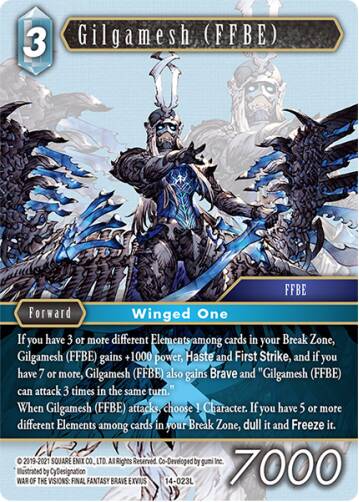 “如果你的损毁区中有3种或更多属性的卡牌,吉尔伽美什[FFBE]力量+1000,并获得加速和先发制人;如果有7种或更多属性的卡牌,吉尔伽美什[FFBE]获得勇气和‘吉尔伽美什[FFBE]一回合可以攻击三次’的技能