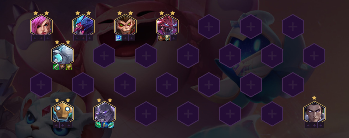 5-1阶段就可以升级8人口,开始搜卡找焰魂、虚空恐惧、齐天大圣2星,只要阵容棋子全二星就能稳定吃分。