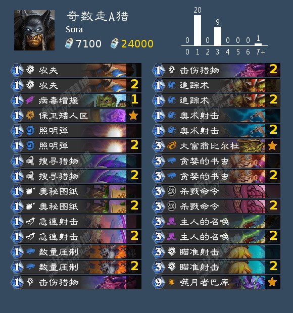 首先是奇数走A猎的总结:现在的状态绝不是狂野模式的T1卡组,完成度有点低,除了1费伤害组件外还缺过牌组件。此外,还需要进一步压缩回合数的组件,在这个构筑中可能是更多的1费牌。Sora以79%胜率打到传说,水苗以66%胜率打到钻5,均为11星。我没有找到第四个观战对象,所以样本量只有63把。