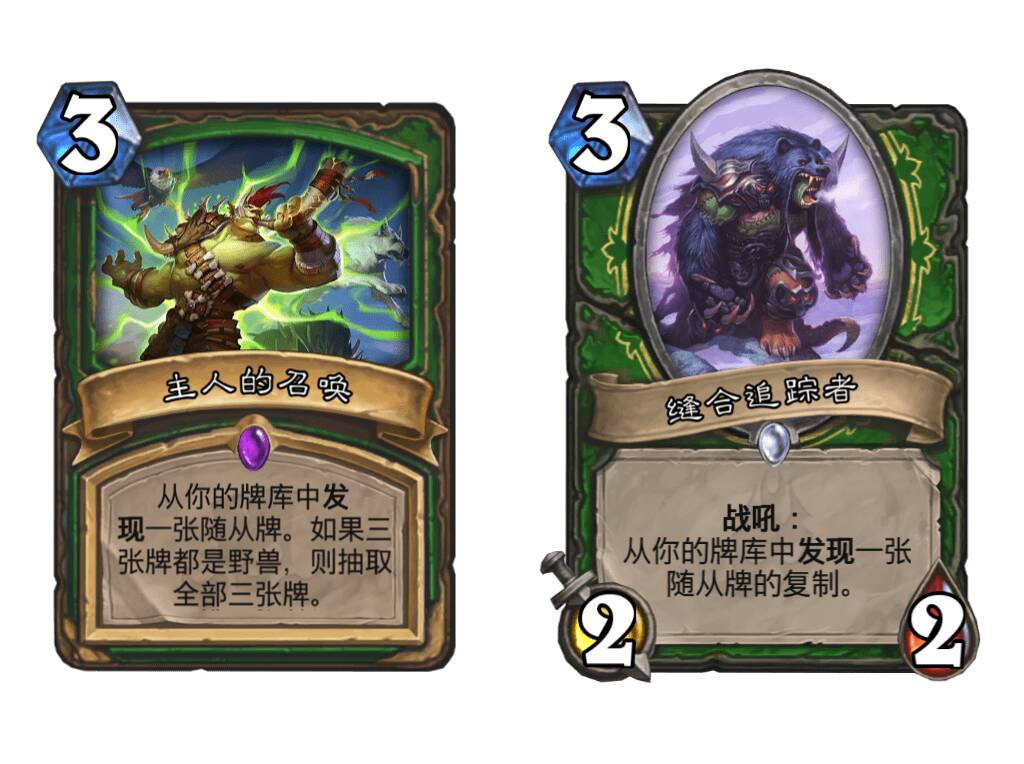 在不携带大富翁比尔杜的构筑中,可以考虑放弃贪婪的书虫而完全携带野兽随从,去用主人的召唤过3张牌。这样主人的召唤所起到的基本不是检索作用而是补牌作用。奇数走A猎可以考虑的选择有: