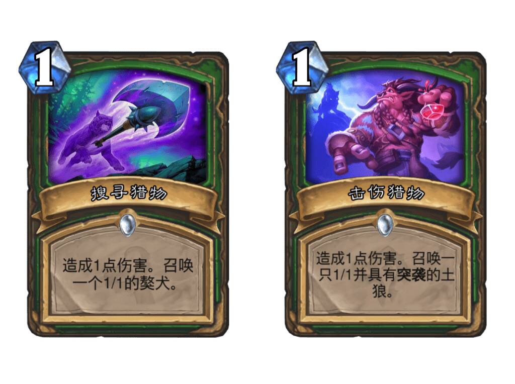 击伤猎物和搜寻猎物这两张必带的牌和数量压制之间有小的组合技,可以在2-3费去解黑眼术,刀贼,鱼人萨,海盗战,比较复杂的场面,也可以在5-6费去解黑眼术和偶数术的随从。此外,这个组合技的另一个组成部分是击伤猎物和搜寻猎物可以为数量压制提供一个目标。