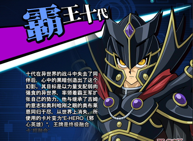 霸王十代登场于游戏王GX的霸王篇,讲述的是异世界篇结束之后为了去救约翰一行人再次闯入异世界的故事。由于目睹同伴们1个1个消失,十代心中的黑暗创造出了这个幻影。