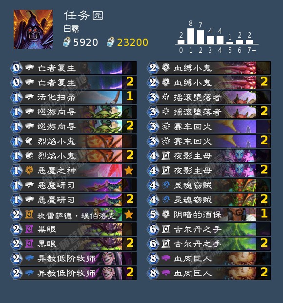 任务术在这波牌表里没那么多,除了不好打快攻,可能也有这方面的关系。这波任务术的构筑也还很不统一,比如白露带的是血肉巨人式的任务园,元素带的是撕牌版本(打吸血瞎倒是有一手),细节变化就更多了。