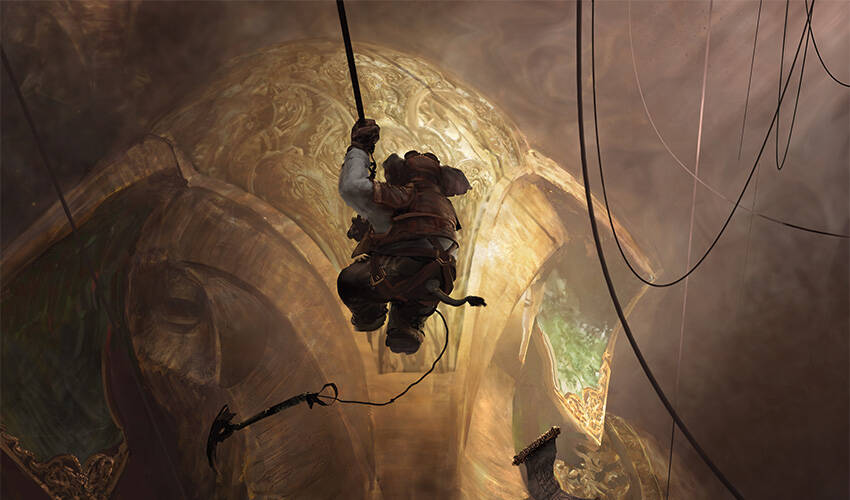 小昆弯曲膝盖并挺起胸膛,一边把背部往洞口倾斜。亚斯特伦跪在岩钉旁边朝他点了点头。将双腿一推,小昆使自己垂降至黑暗中。在刚开始的一分钟内,他看见的只有岩壁。但很快地,开口便敞开为一座巨型密室。起初他认为密室墙面上的闪光是某种沉积矿物。但随着他逐渐下降,他才发现这些闪光来自一座沉眠的象族黄金巨像,上面布满了让他眼花缭乱的内嵌宝石与翡翠。它轻易地就让科玛的塑像相形见绌;他是衡鉴最早期的教授之一,其塑像正耸立于以他为名的学堂中央。