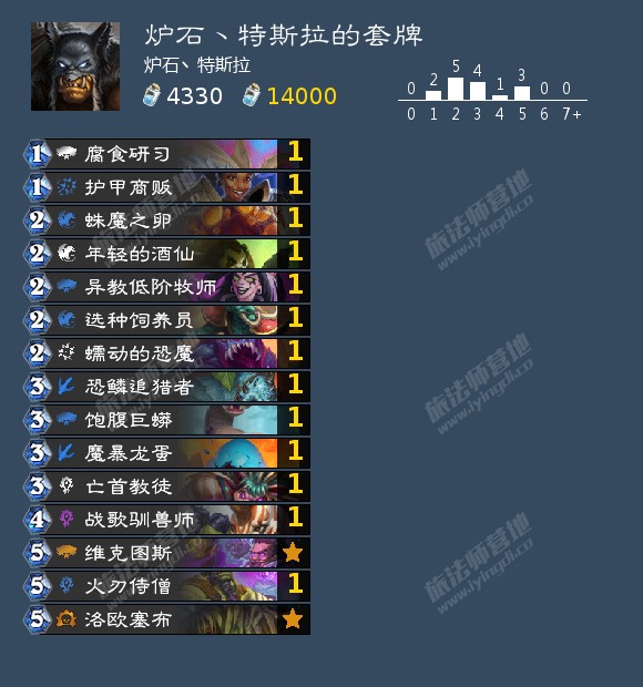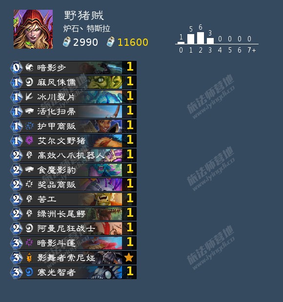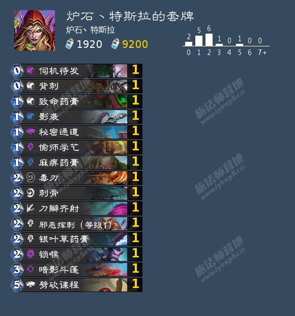 点评:贼打瞎牧劣势(吸血刀),对阵其他职业都比较好出村,宝藏成型之后也是非常高的爆发,新版本成型后我2费秒过35血,也是上限非常高的卡组。