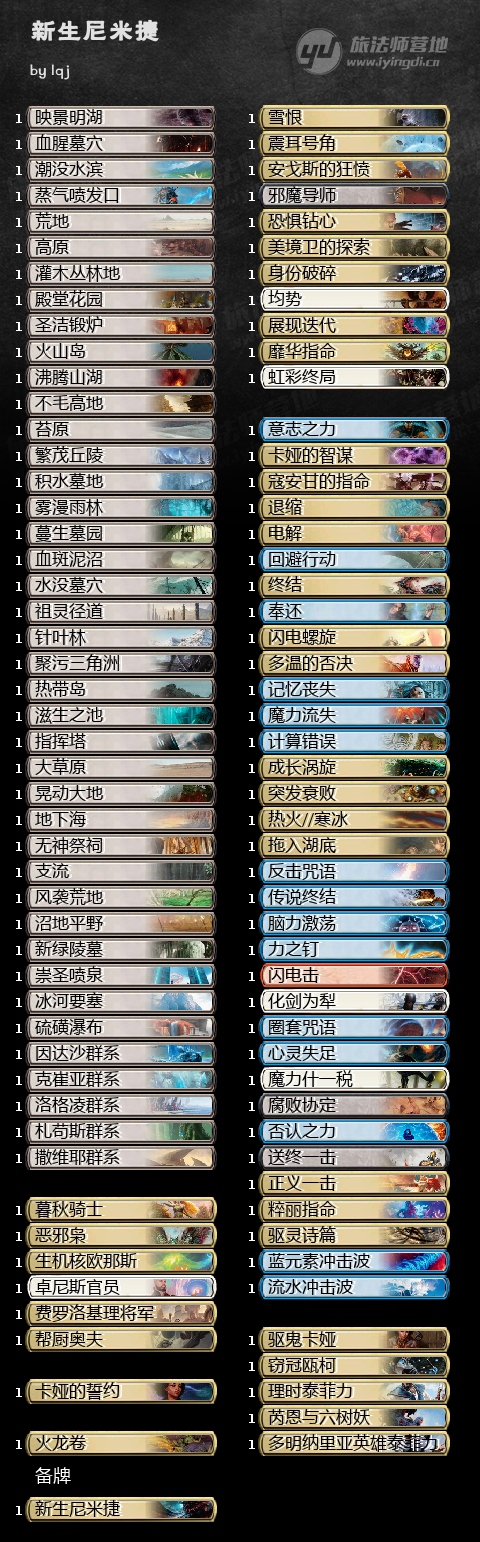 说了这么多入坑法禁的故事,我再说说我这次比赛选择的主将。新生尼米捷是一张发售于2018年5月火花之战系列的传奇生物。2019年的一天,我有忽然在网上看到了一个法禁新生尼米捷的牌表,其中的一张“变境"直接深深的吸引了我。法禁作为20血赛制,7地变境可以直接取胜。而尼米捷充满了地底城魔掌,得见天光等导师。这套五色控混变境的新生尼米捷直接获得了我的青睐。