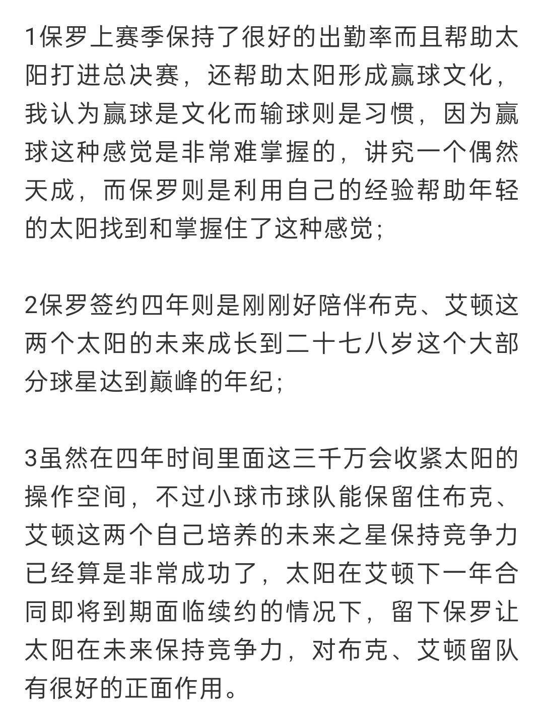 不过,我思考了一下,发现这个合同的细节还没公布呢,而且太阳怎么可能会跟36岁保罗签下全额保障的四年合同,某些网友们先入为主了以1.2亿全额保障合同为基础来讨论这件事,其实当天晚上我也是以这个条件来讨论这个事情的,不过我是从赢球文化和保留双子星的角度讨论这件事的,还有一点球员的身体状态并不是像投篮效率那样会反弹的而且保罗的风格并不会受运动力下降的影响,所以我当时觉得太阳这个选择虽然从实际比赛效果来看会亏,但是小球市球队做出这个选择也无可厚非。