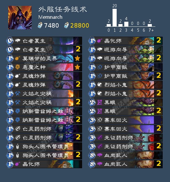 苟活手段:护甲商贩,亡灵药剂师,纳斯雷兹姆之触。这些牌可以提高这套牌的前期生存能力,避免被走A猎、奥秘法等卡组抢死。护甲商贩也可以用来针对黑眼术。不过目前国服高分段的快攻很少,因此我除了纳斯雷兹姆之触之外,并没有携带更多的苟活手段,大家可以根据自己的环境来调整这些牌。