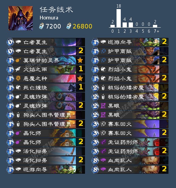 无证药剂师:主要是用来在任务完成后斩杀对手时用,也可以用来裸拍做任务,不过建议只在对阵任务法鬼灵贼等自闭卡组时才这么玩,并且最好要配合黑眼使用,对阵快攻时这样会导致大量卖血,很有可能会被抢死。