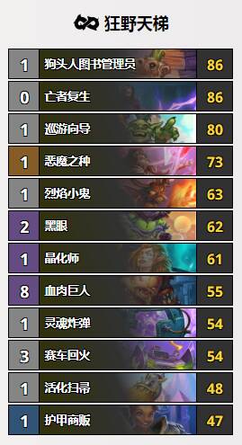 目前来看,狂野高分段天梯里的形态主要是任务术和抓任务术的卡组(黑眼术,点燃法,号角骑等),罕有其他卡组。由此可见,任务术的确是目前狂野环境里当之无愧的T1顶卡组。按照这个趋势下去的话,下一次平衡补丁很有可能会对黑眼自残体系和恶魔之种动刀了。最后祝大家玩的愉快。