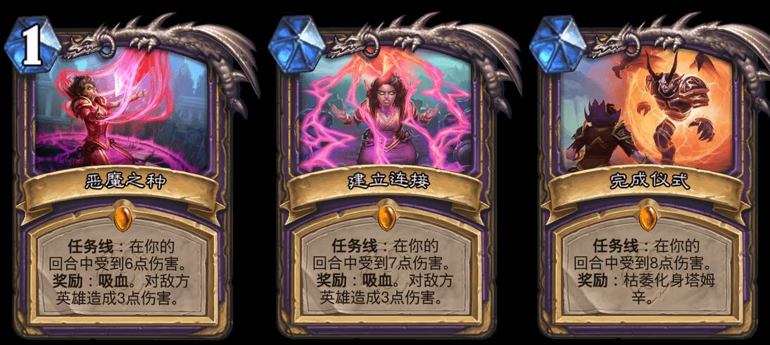 任务术是由新卡带来的新思路,那么我先从这套牌的核心:任务线恶魔之种讲起。为了防止有人真的不知道,我先说一下这张牌的机制:任务线顾名思义是由多个小任务组起来的,完成一个小任务之后会得到阶段奖励,并自动开启下一个任务。这三个小任务的需求都是要在自己的回合内,使自己的英雄受到伤害。最终阶段得到的枯萎化身塔姆辛是5费7/7,战吼效果是使你在本局游戏接下来的时间中,对自己造成的伤害会转化给对手。