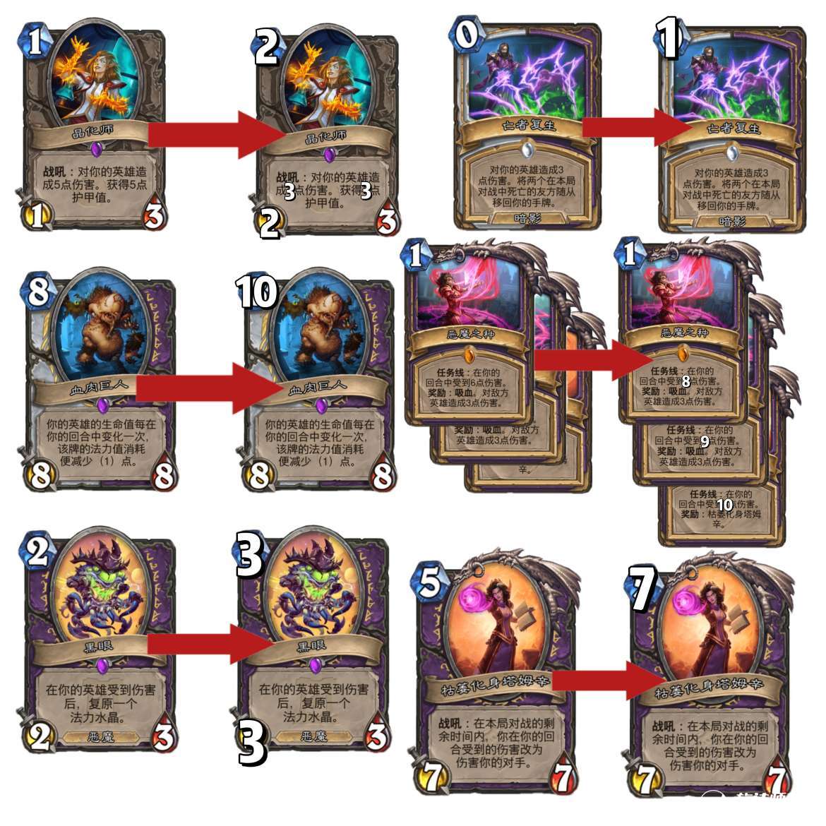 关于晶化师,真的是躺着中枪,从砰砰博士版本出了之后就一直躺仓库,我很庆幸我没有分掉它。这张卡本身并不超模,错就错在它和术士任务线实在是太契合了,前期来了是做任务最快的手段,后期来了,下了任务奖励,就能打5加5甲,实在恶心。