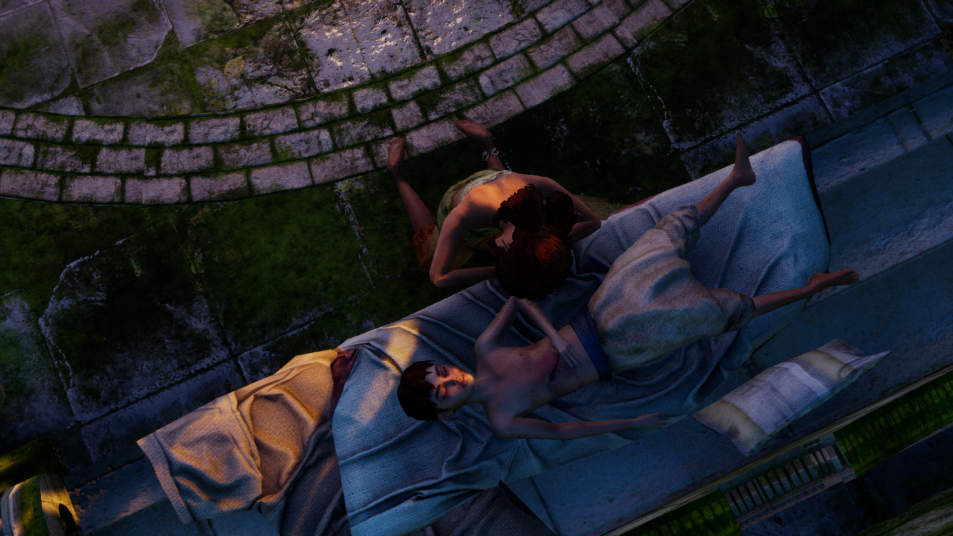 姐姐找到了一处还算高的建筑,这里还没被大水所淹没,她将弟弟缓缓的放在一张石板床上,随后精疲力尽的她在一边守护,睡着了。