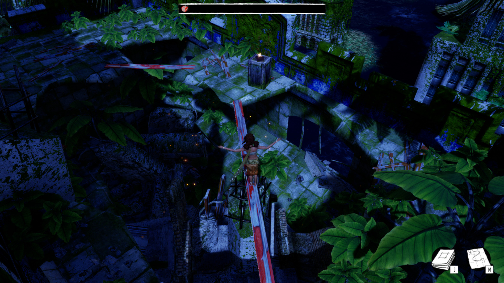 游戏中女主不会因为任何失误而GG,比如在这一块走平衡木,虽然女主晃晃悠悠,无论你怎么按左右她都不会掉下来,同样女主也不存在踩空的情况,像是有一股无名之力在保护她。