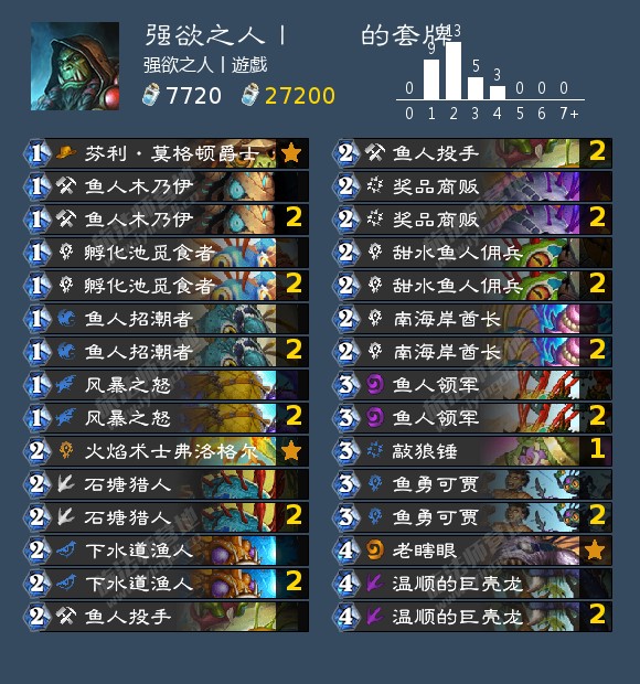 极限快攻重点是一费二费有节奏,一费能打能抗的鱼人我全派上了,二费鱼人更是不乏节奏好卡,所有节奏鱼人全部可用,这套卡只需要站场等待BUFF,所以屁股大更重要,同种功能鱼人对比,奖品商贩胜过鱼人投手,猎人胜过佣兵,酋长胜过蓝腮,猎潮和古神猎潮身材太弱更不用考虑,BUFF我选择风暴之怒、鱼勇可贾、领军和巨壳龙,费用不高而且功能强大,这套牌的灵魂是鱼勇可贾鱼人领军和下水道鱼人,这三个必须满编