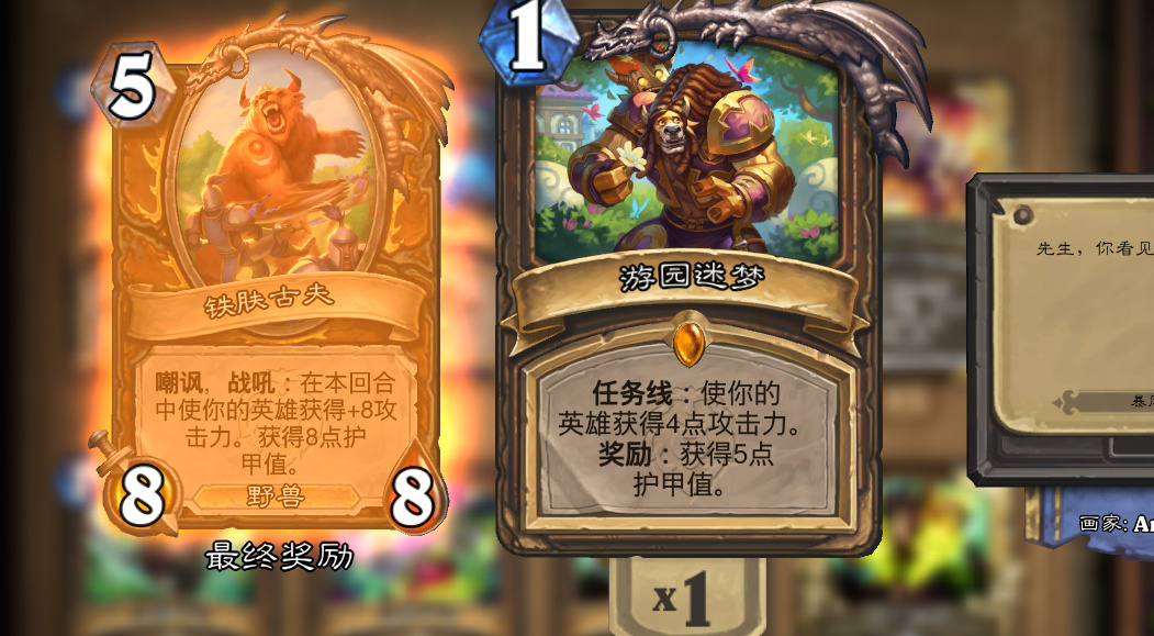 先手正常操作一费挂任务,二费技能,三费技能(+1费牌)就可以满足一阶段任务,四费拍一张3费的buff牌(1费有啥拍啥),5费打3费BUFF牌+技能,前期有爪击,巡游向导的话四费就能过2阶段任务,五费3阶段任务六费就拍古夫叫杀了(有时候5费差2点攻击力6费一张一费爪击也能把古夫拍出来),同时过任务的牌+任务奖励可以有将近20+的护甲,满血就是50的血量,像鬼灵贼,点燃法一类的otk大概率都能挡住,已经任务完成启动的任务术,任务猎,每回合打20也还能挡两个回合,没有墙的话足够斩杀了。