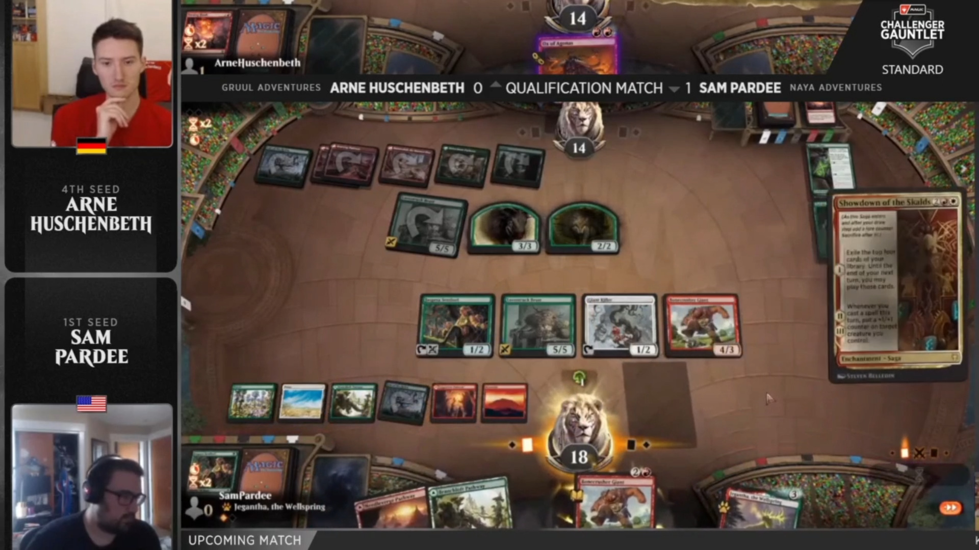 首先是胜者组的历险内战,Sam Pardee操控更有优势的纳雅历险,在僵持阶段掏到了比对面多的白色牌:北地诗人赛诗会,资源直接碾压,这也让他成为首个确定四强的牌手。