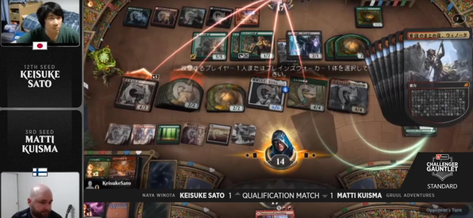 被打到败者组的Matti Kuisma对上了操控纳雅薇诺塔的Keisuke Sato,可惜命运弄人,正在他马上就可以反攻获胜的最后一个回合, Keisuke Sato神抽聚力领袖薇诺塔,把整个牌库的人类都翻了出来。