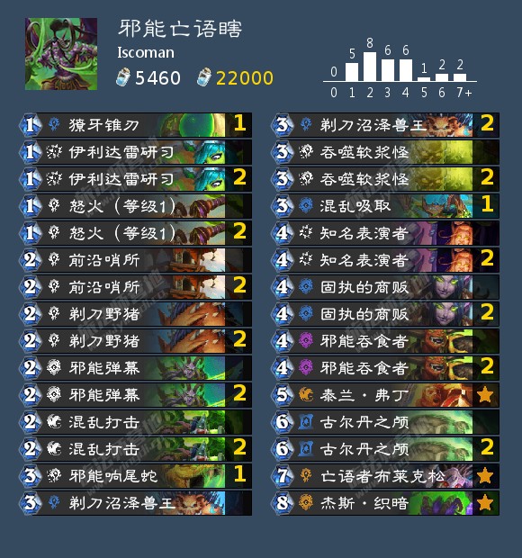 Iscoman将两个体系的牌融合在一起。除了亡语体系他还加上了邪能体系,这些邪能法术本来就都是伤害,前期配合亡语生物解场效率不错,中后期还可以配合杰斯织暗打一波大的爆发伤害。亡语瞎是老卡组了,靠着前期强力的站场能力可以只打脸把解场的烦恼交给对手,现在有了杰斯的爆发后期有更好的终结能力