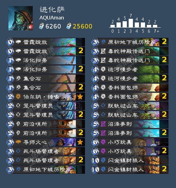 之前写过很多进化萨的卡组了,这套进化萨该带的牌基本上也都带,我觉得这个卡组至少有20-25张是固定卡位,都是萨满这个体系的超模牌。我觉得亮点是二费橙卡伯尔纳锤喙,卡组里有扫把,笼斗管理员这种低费战吼,如果你先用伯尔纳锤喙配合原初地下城历险者,再有这些低费随从配合可以过到非常多的牌,有足够的手牌数量萨满就可以打出连续的爆发,豺狼人的费用也更低,面包师也有机会回更多的血。看驴鸽直播玩进化萨的老哥应该知道,这个卡组只要站住场面一波进化两回合就可以打死没有解牌的对手,唯一让人高血压的地方是豺狼人老变自己或者兔子坑人。