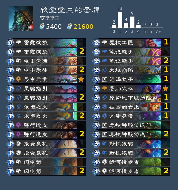 探险家这张卡让我想到影之诗的噩梦开始,三过二带检索还能拍怪。我个人非常喜欢所以基本上所有的萨满卡组都带了。从自己卡组里过出来的法术即使不是自然属性质量一般也是比发现要高的。而且这套的自然法术浓度其实还可以。去掉狼魂换前锋就更高了。