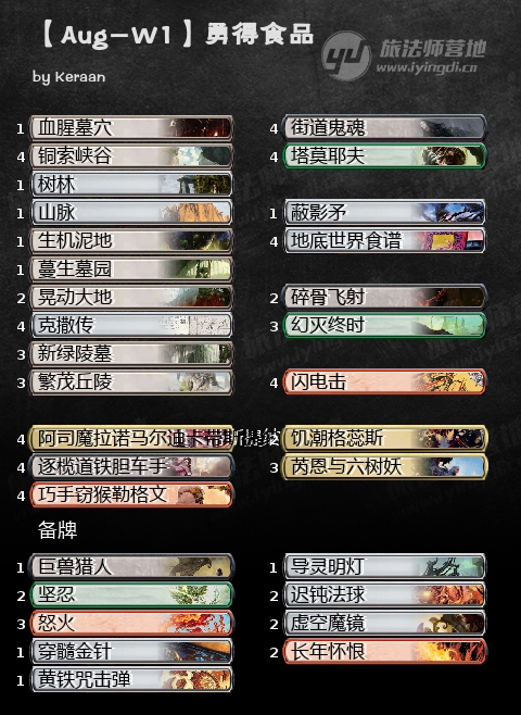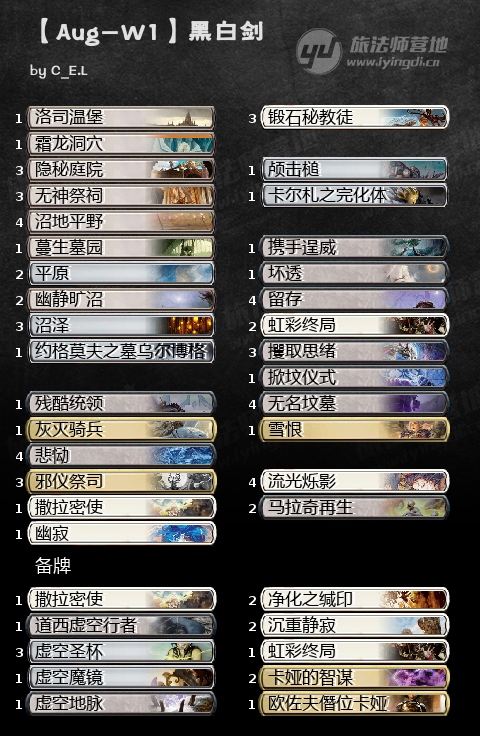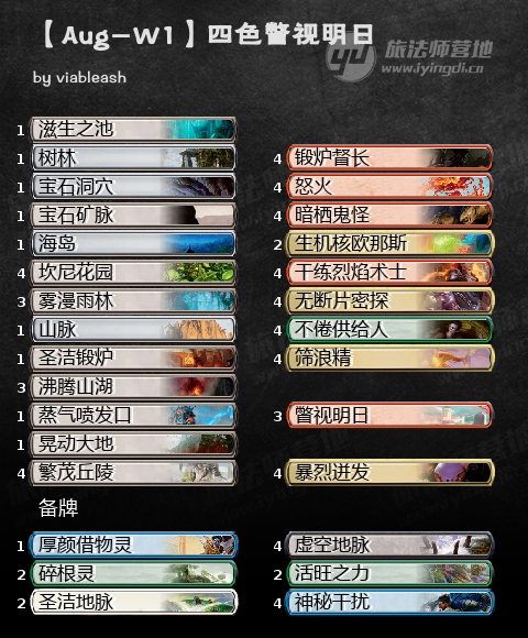 之前有摆过这个思路的套牌,四色瞥视明日,本周这套牌获得了巨锤场的第5,开始有一些强度了。整体构组也是偏向于中速歪流,基本都是些进场就能给作用的单卡,并不是纯粹的至暗时刻拽大哥思路。虽然说,即使瞥视明日被康了,也能靠其他中速手段把对局继续下去,不过问题也正是如此,这个比赛也就仅仅是继续下去,吊着一口气,没有太多的强度,所以也还是要靠备牌盘盘康才行。