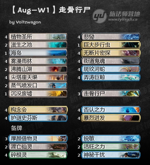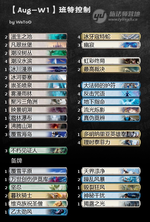 咦~这套牌有意思呀,控制套的另一个选择。这牌其实很像薪传的班特控制,虽说是控制但是整体比较主动,冰牙寇特蛇虽然身材矮小,但对于控制套而言这张前期能换小人后期能换大哥不亏牌节奏还好的单卡简直是梦想,对比之前洁斯凯的预兆墙,冰蛇真的是神卡。此外,这套班特还**了不朽见证人+地下指命的无限循环玩法,为控制套提供了一个致命死锁手段,很是合理。不过如果是我的话,我可能会把两张幽寂换成迅咒法师,这样能更好的利用自己坟场的法术瞬间。