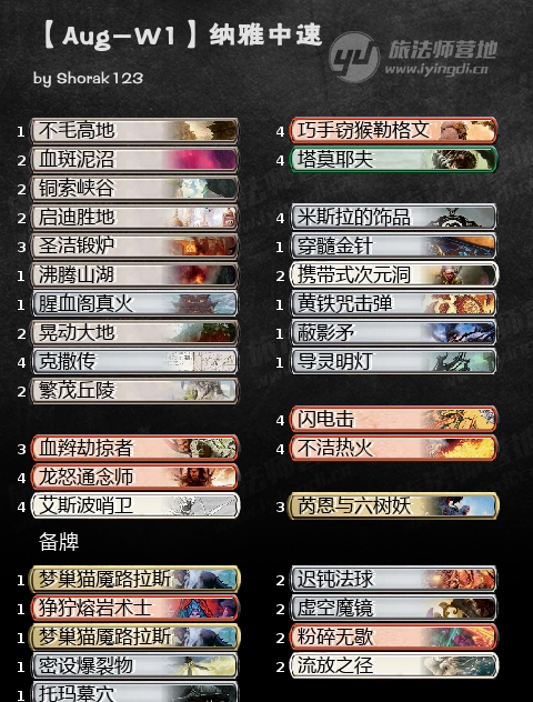 这样的纳雅中速可以跟之前的格利极或者玛尔都中速横向对比,沾绿主要是多了六爷和鳖,然而要么是放弃了黑色的手牌破坏和优质点杀,要么是放弃了蓝色的高效cantrip,不论怎样对比都觉得这样的牌特别不灵动……有一种很笨重的感觉。但是我的小伙伴好像很喜欢这牌,一顿吹,觉得点杀贼多,踢起来很凶。嗯我没碰到过,也没见过这牌的对局,有操控或者对局经验的小伙伴们不妨留言告诉我们这牌到底怎么样~
