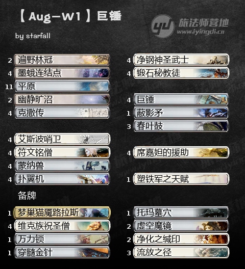 8月7日的挑战赛冠军是巨锤,这个版本的巨锤并没有使用妙手铁匠,转回了之前4张符文铭僧的版本,不过意外的是,即使下了妙手铁匠也没有重新带回塑铁军的天赋,可见挤走天赋的单卡并非铁匠而更可能是没有什么代价的克撒传。虽说巨锤一出生是一套极限组合技,但是经过环境的更迭,套牌的优化,目前基本上变成了一套很稳定的套牌,上能2回合天胡,下能长盘消耗,还是强的。
