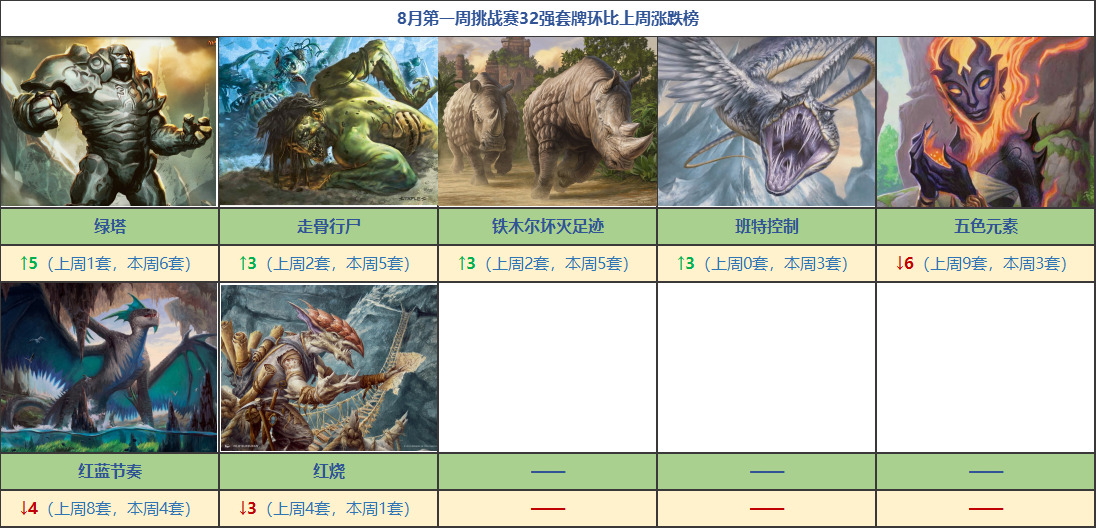 本周的单套牌涨跌情况如下图,显然绿塔环比上周加了5套,增长最多,与此同时走骨行尸与铁木尔坏灭足迹的使用量也环比上涨了3套,此外一套崭新的班特控制横空出世,有3套牌新进入32强行列;下降方面,五色元素热度昙花一现,本周环比上周骤减6套,红蓝节奏环比上周有4套的降低,本周红烧仅有1套进入32强环比上周减少了3套: