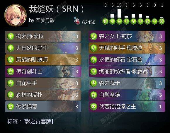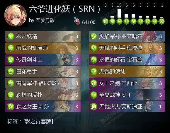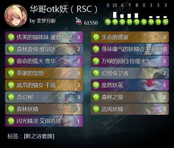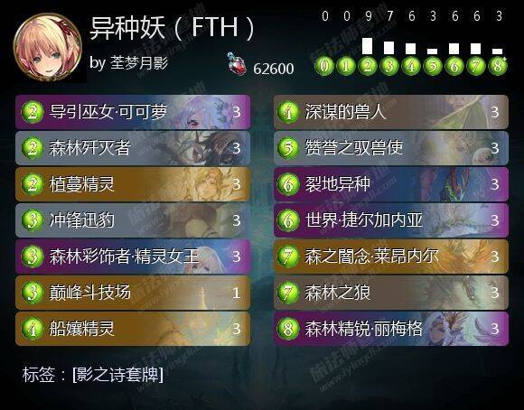 最后一位讲谁,其实我想了很久还是感觉得至少把这位前一段时间引起了不小轰动的构筑拿出来讲讲,毕竟从妖精本身连击的角度出发,华哥OTK是妖精连击模型的一个重大转折点,而从虫妖以外的OTK构筑来讲,华哥OTK应该也是几个OTK构筑中对环境影响最直观也最夸张的一位,这个卡组还是希望以后有为了了解影之诗历史卡组的新人兄弟能看到的。整套构筑除去为了防止组件短时间无法凑齐而携带的部分雪华+黑阿丽雅作为planB和过牌轴以外,完全围绕华哥单卡构筑,通过凑齐大量0C和可以一回合打出多次连击的组件,借助华哥自身连击的三段近乎完美契合思路的效果:连击4回复3点PP,连击8进化(华哥的进化后可以攻击两次),连击12获得+3/+3与疾驰,由此单卡完成16点爆发伤害,配合诸如优美的猫姊妹·暹罗与暹玛、闪光精灵·艾珥芭塔、森林游侠·维尔达所提供的其他直伤,最快能在4C、一般5到6C完成OTK。而如果真的没有办法一波直伤打死对手,这套构筑也有另一个组合技选择:通过生命的盛宴与众多组件或者华哥本身combo,配合原先英雄的觉悟所提供的守护与+2/+2效果直接展开一波夸张的场面压死对手。这套构筑在当时同样自闭的黑叔叔(荣华加护神·亚忒朗图,在削弱中直接被重做,原先的效果可以在护符破坏到一定熟料后同时完成己方巨大展开,敌方复数消失,回复与直伤最高15点的可怕动作)护符教几乎霸占了整个天梯,除了部分可以通过马速致胜的皇家可以相比外几乎难以见到其他卡组,使游戏环境极端恶劣。这样的环境也很快引起了官方的注意,并在一周左右的时间后进行了大刀阔斧的削弱,才算是换来了一个相对平衡的环境。