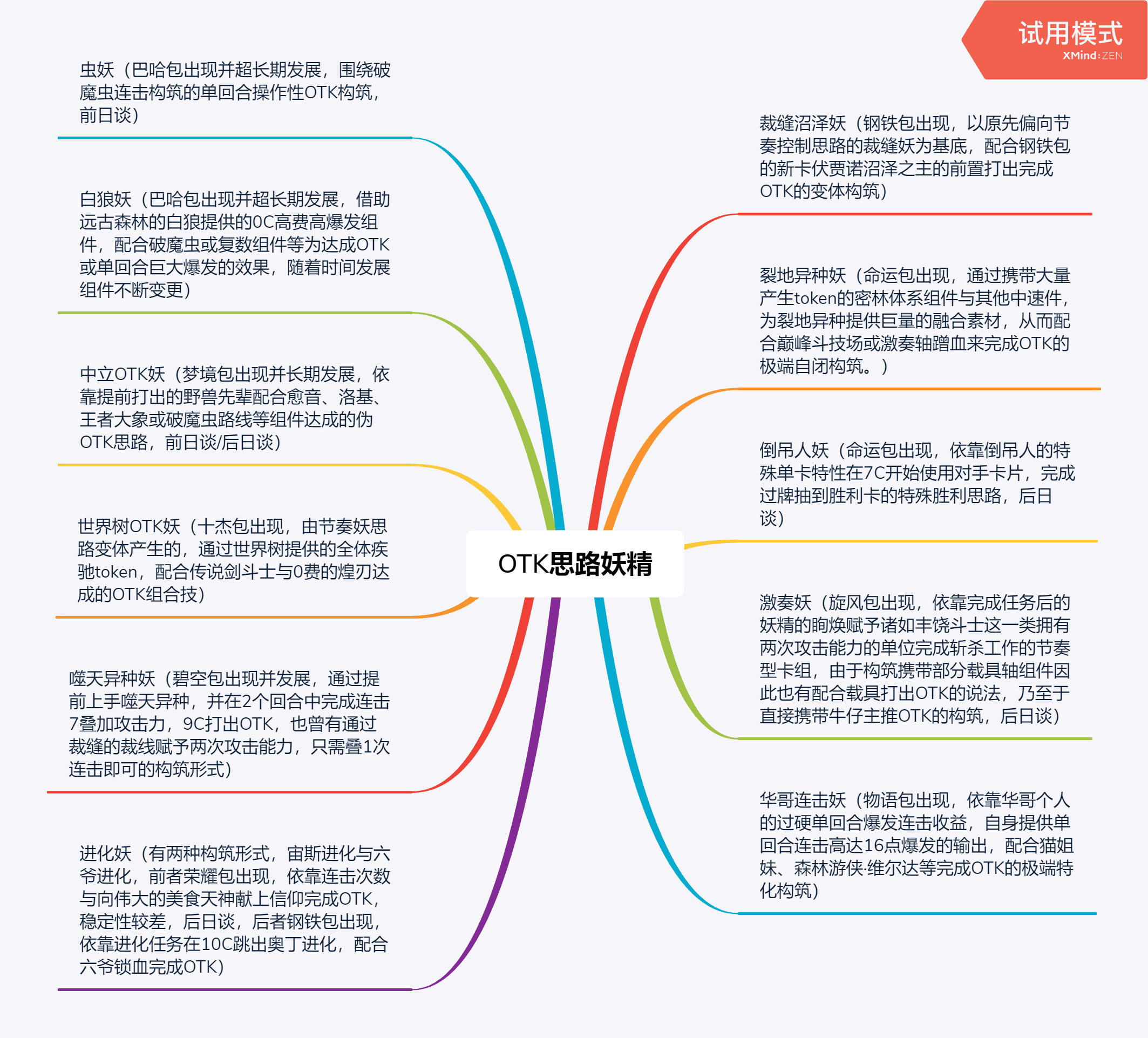 从影之诗这个游戏角度出发,OTK曾经是控制思路进行限速的主要手段,但随着时间的演变, 随着版本模型的变化,尤其是直伤模型的不断廉价,现在已经出现了众多拥有OTK能力但同时也能保证常规节奏的构筑,OTK这个名词不再仅限于传统的那种需要前置让节奏的方式凑齐组件的组合技了,而已经开始渗透到各种各样其他的领域角度中。我很难去辩驳这种情况的好坏,一方面OTK的泛化确实算得上是对游戏计划的多元化,是对一个思路可玩性的提升,但另一方面,当OTK不在昂贵,那种凑齐组件最终完成爆发的乐趣还是有相当程度的减少的。不过我还是相信,未来会有更多诸如以前的白狼妖那样,真真正正拥有纯粹血统的控制OTK出现,也希望设计师能好好考量包括OTK在内的众多游戏计划,从中找到比较好的平衡点。