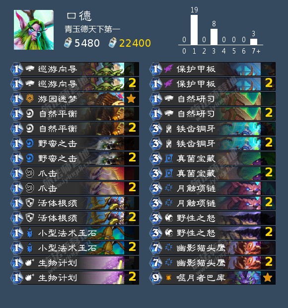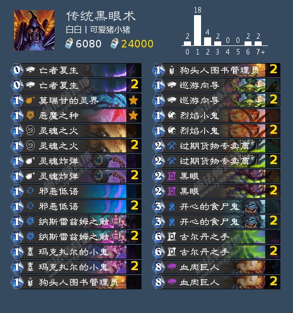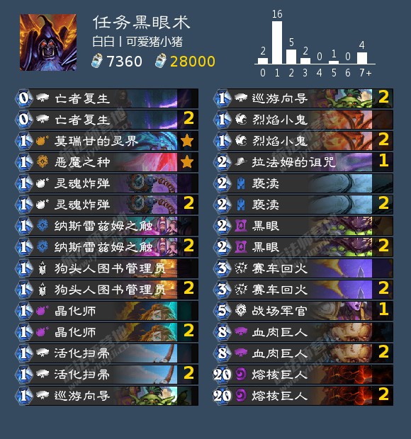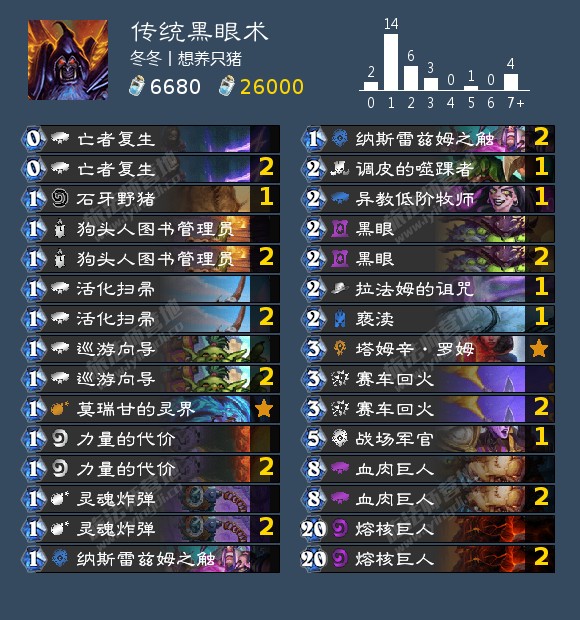 这是冬冬在前200打出60%胜率的传统的黑眼术,这套卡组的目的更单纯,极致的追求前期,满编力代可以配合小野猪打出高额的爆发,不过冬冬调试了一天后还是选择回了任务黑眼术,实战表明带任务的强度更高。