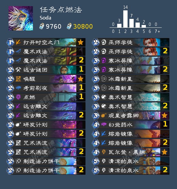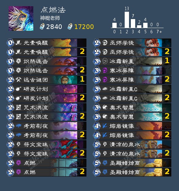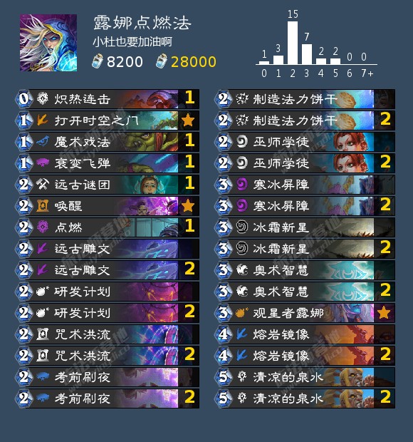 高分段的法师除了点燃法就是前前前前朝之剑无限火球法了。点燃法的形态也大致分为三个版本:任务点燃法、露娜哀绿点燃法和圣殿蜡烛点燃法。带任务的点燃法节奏更慢,不过开门可以破冰和解决手速不够动画过慢的问题,这个强度应该是三者最低。露娜点燃法依赖露娜和哀绿的组合,开洪流的情况下单哀绿就可以启动,没摸到洪流得苟到双哀绿到手才能开刷,这个也比较依赖牌序,不过过牌,冰系法术和冰箱的存在让我们更有生存力。我觉得强度最高的属带元素圣殿蜡烛商的这套,配合元素唤醒可以提前启动而且而且卡组9张过牌,配合露娜完全可以过穿牌库无限刷点燃,整套卡组只为刷点燃服务,俗话说纯度越高强度越高,我觉得这套点燃法是冲分的不二选择。(感谢现在的环境无脏鼠和吃手手)