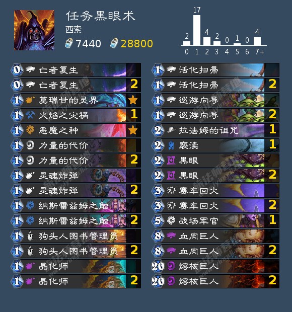 第一套是白白丨可爱猪小猪中午登顶的卡组,第二套是西索早上登顶的卡组。二者区别在于亵渎和灾祸的选择,双亵渎更好的应对快攻和内战,亵渎尤其是在内战中有出色的表现,配合灵魂炸弹可以做到清场和返场。不过灾祸可以小怪换大怪,仁者见仁智者见智吧。在留牌方面除了扫把,一费都留,任务的每个阶段都有说法,第一阶段可以选择抽两口配合狗头人完成,或者双烈焰小鬼;第二阶段7可以分为3+4或者2+2+3或者2+5,如果节奏好三费可以晶化师+抽一口刚好做完。第三阶段可以4+4或者3+3+2或者2*4,具体怎么选要根据场面来决定,因为加入任务后每次完成任务都会吸血,所以血肉巨人更容易在前期加入站场,所以前期给对手的压力不要吝啬。