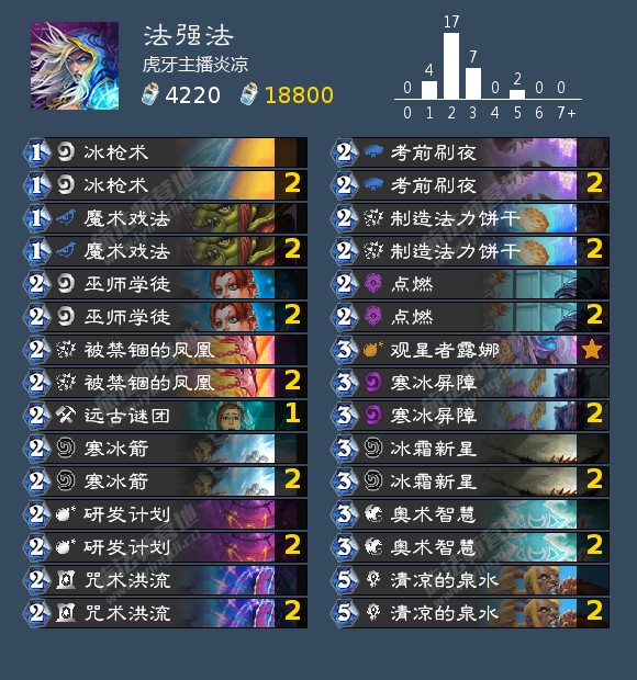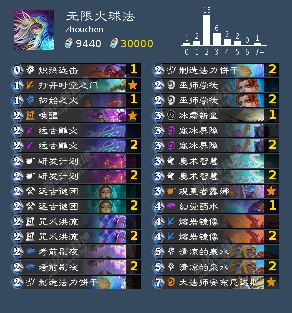 下面是zhouchen的无限火球法,在这个全员提速的时代,能坚持无限火球法的玩家已经不多见了。这套卡组的劣势对局是黑眼术和厕所骑,其他对局都是小优或者均势,在现在的环境不太契合,不过等黑眼被削弱后也许会迎来春天。(在打没有带诅咒的黑眼术时也还有一战之力)