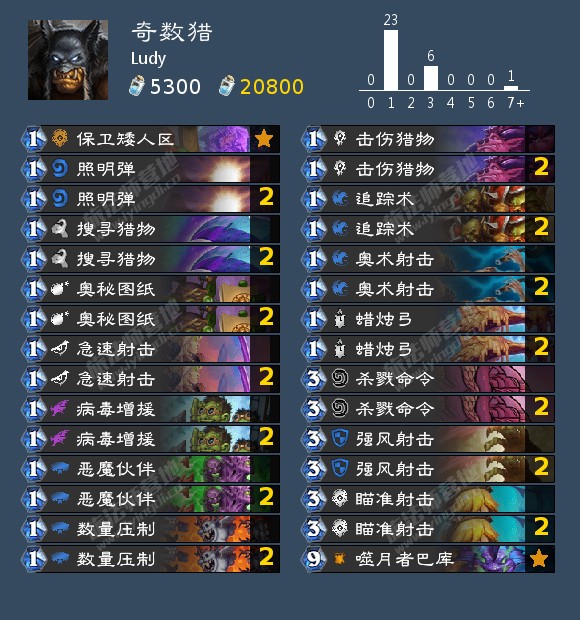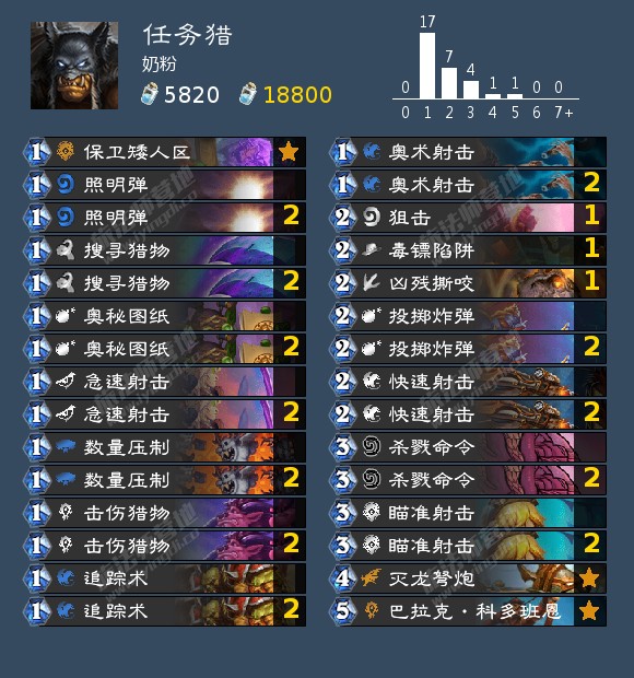 这套是虎牙主播奶粉的一套任务猎,他在新版本第一天用这套以11-2的成绩冲上了传说,不过他的原卡组是-1毒镖陷阱+1病毒增援 ,我实战后发现也许毒镖陷阱更契合当前环境(主要还是黑眼术太多了)。这套卡组舍弃奇数体系,因为有任务的存在,灭龙弩炮可以在6费前加入战场增加伤害,而且快速射击2费打3的伤害挺契合当前卡组,资源链也不容易断掉,只有保证5费能拍下577基本都可以拿下对局。关于巴拉克奶粉有句话: