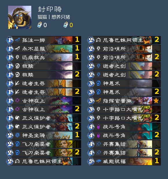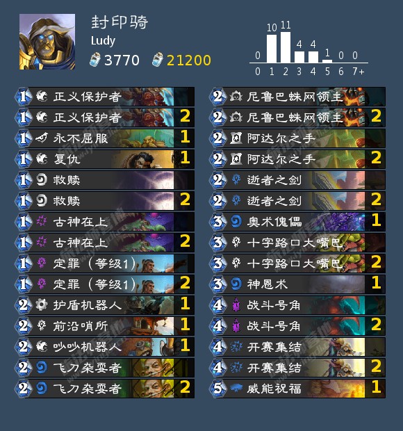 这套是ludy的厕所骑,满编了定罪用于斩杀,奥术傀儡的冲锋效果可以给黑眼术当头一棒。这套卡组的主要食粮就是黑眼术和口德。关于一些抉择点:如果对手是任务黑眼术,手里有厕所和尼鲁巴,先跳厕所后上尼鲁巴,前期就刮痧(记得防亵渎),对手会被恶心的直接跑。