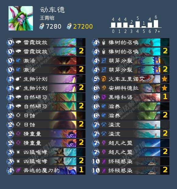 打慢速一般考虑在开超凡的当回合斩杀,豹子提供一点法力水晶,配合橡树出安娜或者手牌中打出安娜,当然也可以通过雷绽生物计划滋养回水晶中转后溢流感染过到安娜或者橡树。再进行斩杀。