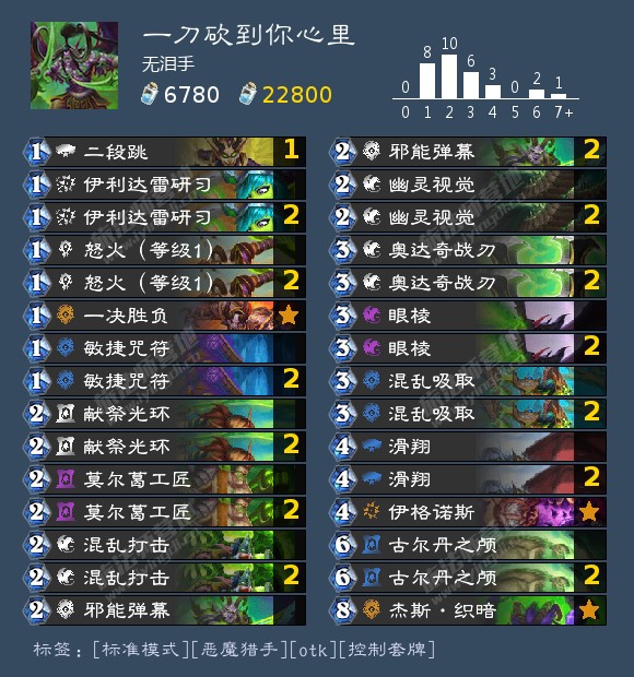 (1)过牌组件:过牌组件主要是用来做任务的,只有三张牌需要注意:头,滑翔和咒符。头是除了任务奖励之外的唯一减费手段,卡组润滑剂,只能用来做第一阶段的任务,配合咒符可以做第二和第三阶段,玩过瞎子的基本都知道头的重要性。滑翔是任务内战的大杀器,因为我们一个滑翔,对面任务基本要晚一到两个回合做完,这样就能拉开任务,打中速萨满骑士战士可以滑buff过的牌和萨满抽上来的刀,奇迹贼滑减费牌和硬币,猎人不滑对面,除非对面上回合上过535且牌库没有老婆。咒符是延迟抽牌配合头可以做任务,但千万不要做出这回合咒符下回合滑翔的操作,除非咒符减过费,然后你确实很需要下回合过两张。