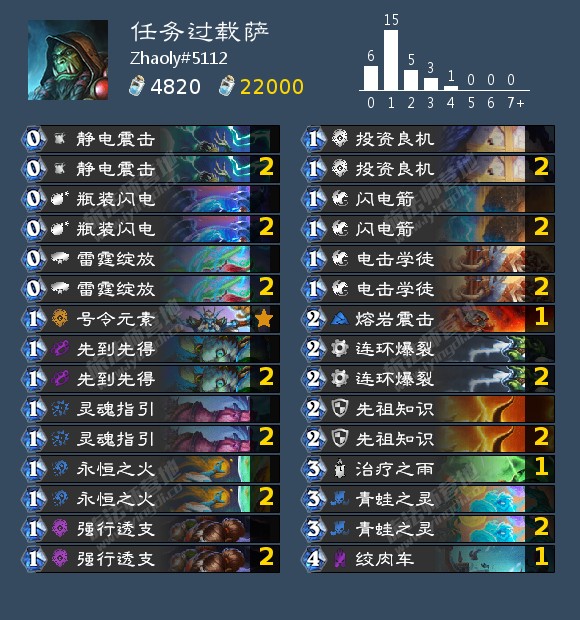 来自Zhaoly#5112的一套任务过载萨,他使用这套卡组以61场67%的胜率最高打到第381名。卡组的主体思路通常靠完成任务后直伤斩杀。抉择点较多,很考验操作者的熟练度。强行透支是最主要的伤害来源,单回合极限伤害可达50以上。如果预期需要20点以上的斩杀则务必留一张透支,闪电箭和连环爆裂可以卖掉缓解压力。