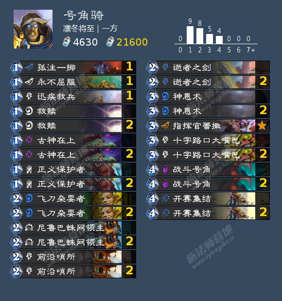 ④号角骑:小劣对局。十字路口大嘴巴、前沿哨所、威能祝福都是崩盘点。先到先得和灵魂指引可以提供一些额外的aoe。永恒之火必须留给战斗号角和开赛集结,不要被小场面骗出去。