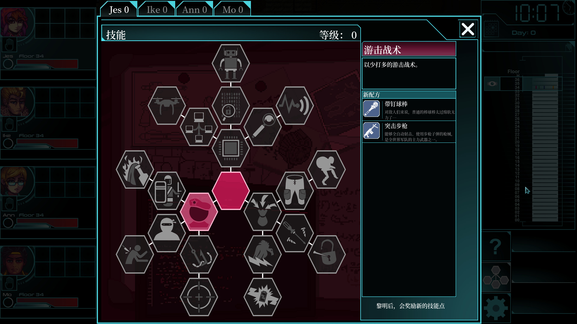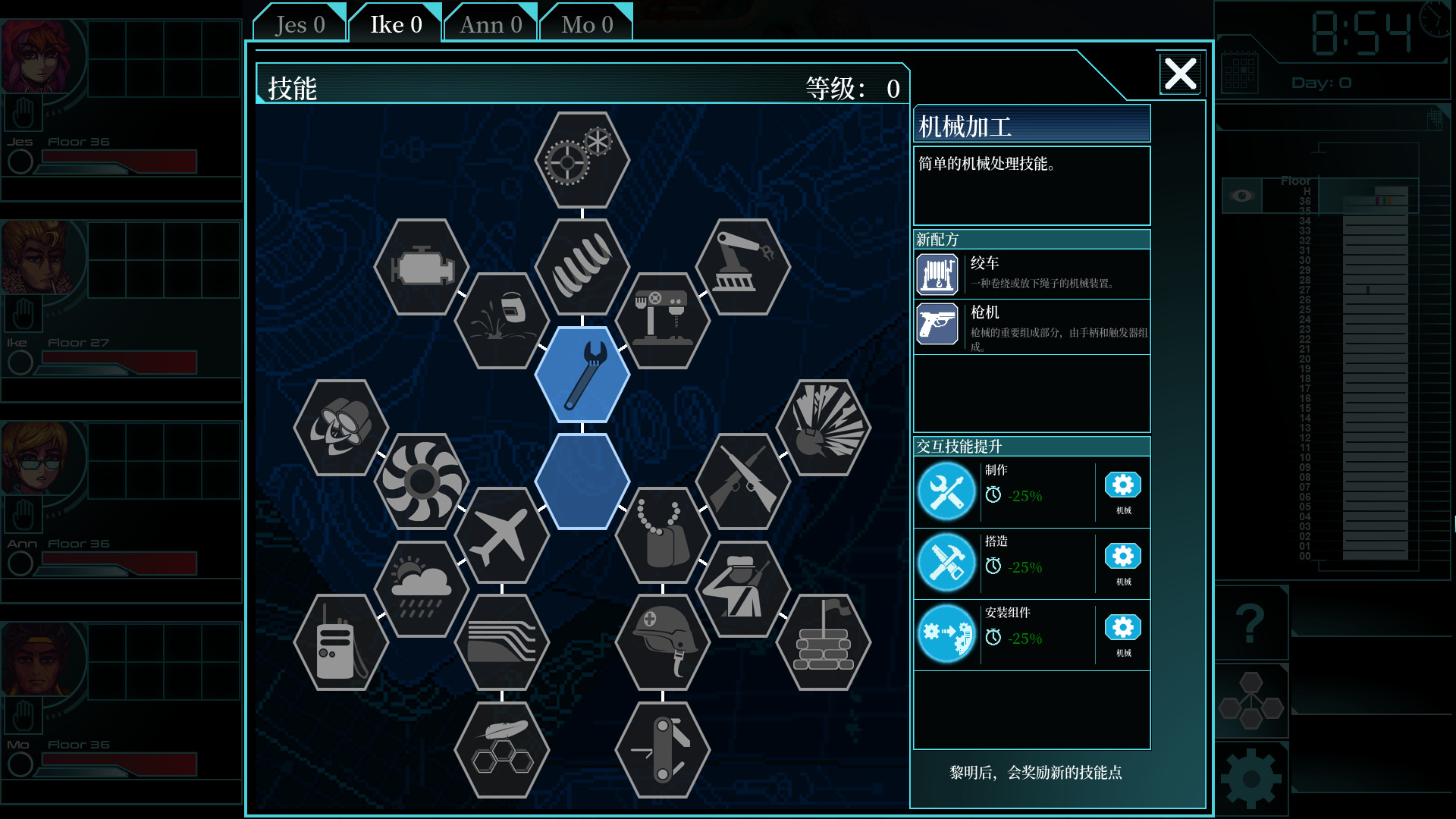 右下角三个键也没什么好说的,除了齿轮暂停之外,问号是让你重新看一下之前那个破教程。而中间那个则是技能树,每到新的一天就会奖励你若干技能点。
