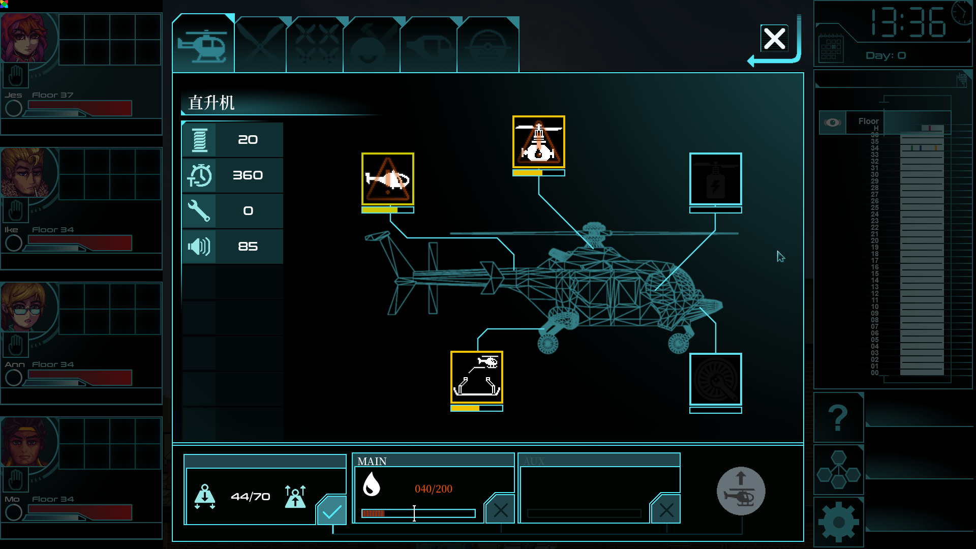 在看了半天之后我终于理清了思路:这栋大楼一共有36层加一个天台,而天台上有一架残缺的飞机,我们的任务就是在丧尸**们之前,修好飞机然后离开。