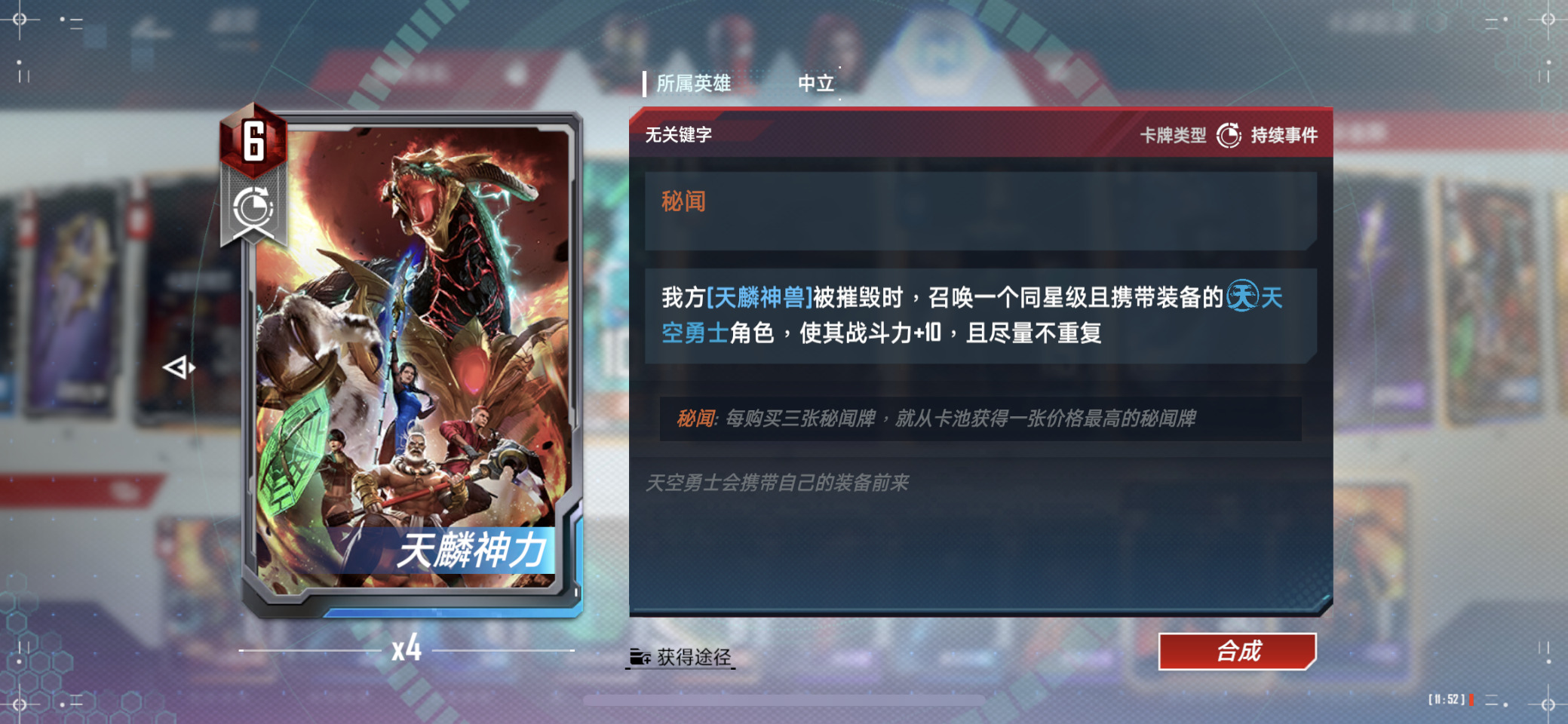 (4)、如果选到“英雄责任”和“秘密行动”技能,则可以早一回合升级到五级商店(如果血量较低则停留在4本继续搜天空卡),“英雄责任优先使用高费优质怪来过渡,本套卡组“英雄责任”不是4块钱基本不选,优先选择“秘密行动”技能;
