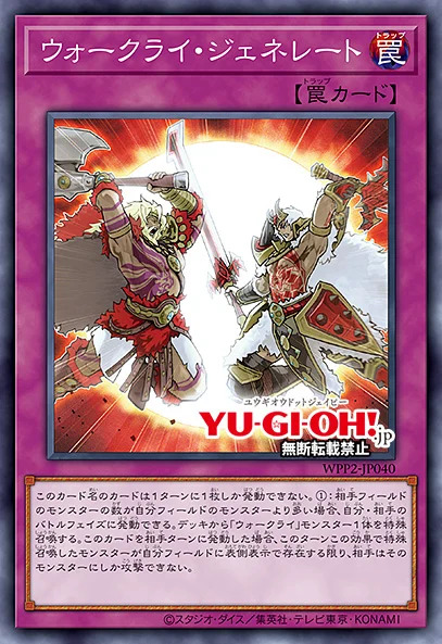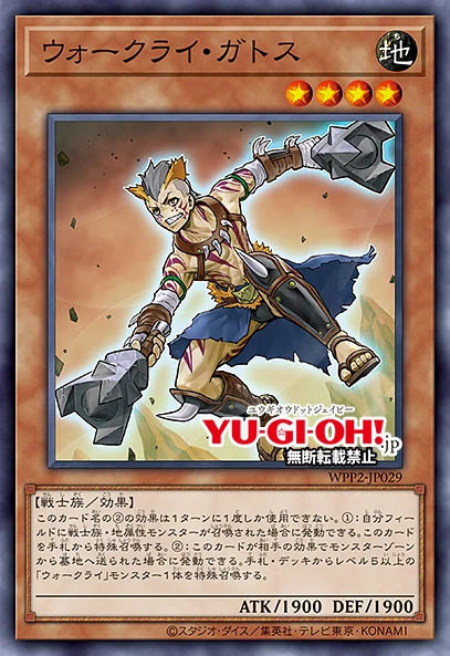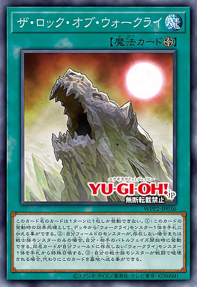 ②:自己场上的怪兽不存在的场合或者只有战士族怪兽的场合,自己·对方的战斗阶段开始时才能发动。从手卡把同名卡不在自己场上存在的1只「ウォークライ」怪兽特殊召唤。